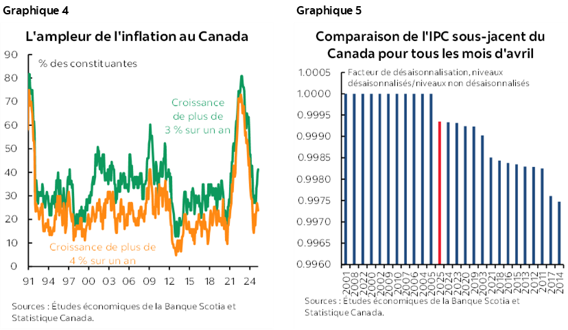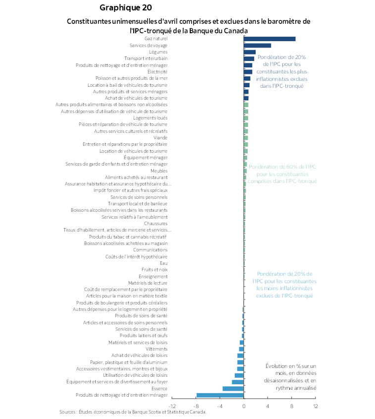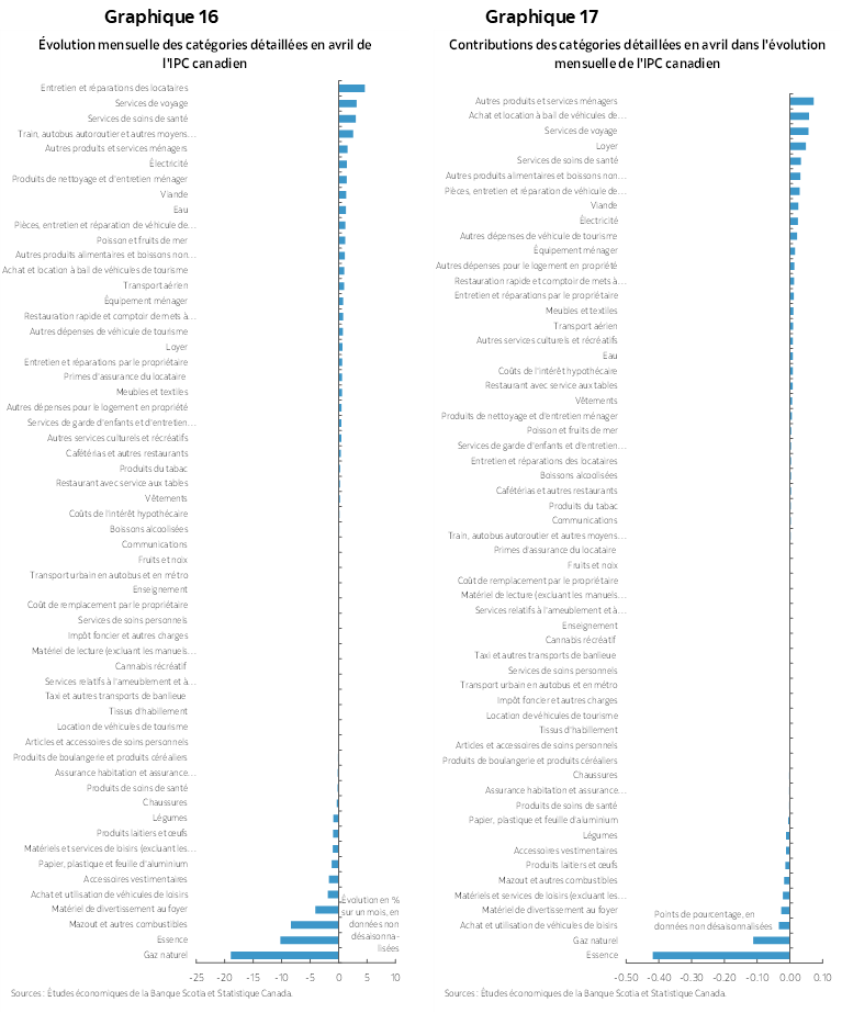 Les marchés ont réagi en réduisant l’anticipation d’une baisse le 4 juin pour passer de ‑17 points de base avant l’IPC à environ 8 points de base aujourd’hui. Curieusement, le dollar CA s’est déprécié aux vues de ces chiffres, avant de regagner environ un quart de cent par rapport au dollar US après la publication de l’IPC. L’anticipation des baisses de taux de la BdC pour l’année complète est aujourd’hui flottante et varie entre ‑25 points de base et ‑50 points de base par rapport aux ‑75 points de base anticipés au début d’avril. Nous continuons de prévoir qu’il n’y aura pas de baisse cette année, même si nous intégrons constamment de l’information nouvelle dans nos projections.