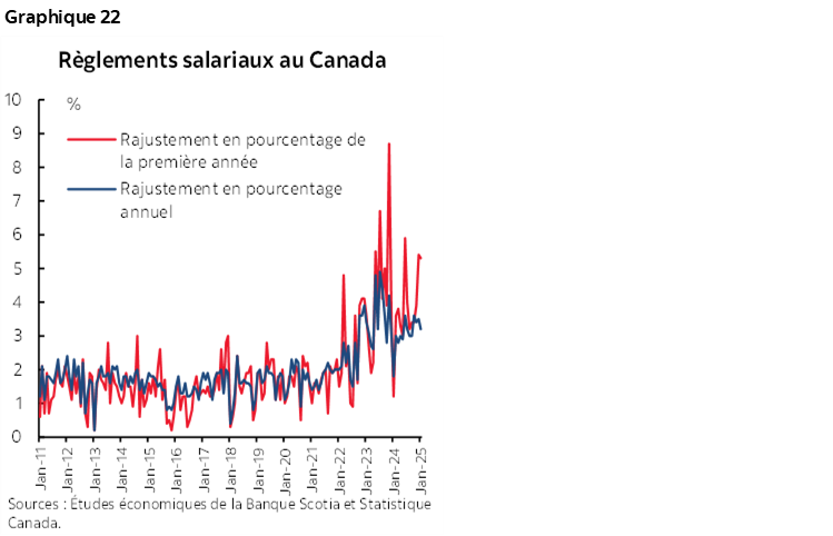 Il faut aussi noter que la croissance des salaires reste explosive dans les règlements contractuels (graphique 22). À l’exception de nos chers lecteurs, dont vous faites partie, le Canadien moyen touche des hausses de salaire supérieures à la croissance tendancielle de la productivité, qui est moribonde.