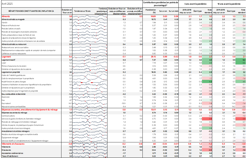 - IPC canadien, évolution en % sur un mois//sur un an, en données non désaisonnalisées, avril 2025