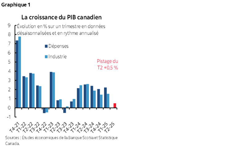 L’économie du Canada est assez vigoureuse pour que la Banque du Canada s’abstienne de bouger mercredi prochain; il y a aussi d’autres raisons qui le justifient. Nous continuons de penser, depuis longtemps, qu’il ne faut pas modifier les taux d’intérêt. Le graphique 1 fait état de la croissance selon les comptes trimestriels du PIB d’après les dépenses et les revenus mensuels jusqu’au T2.