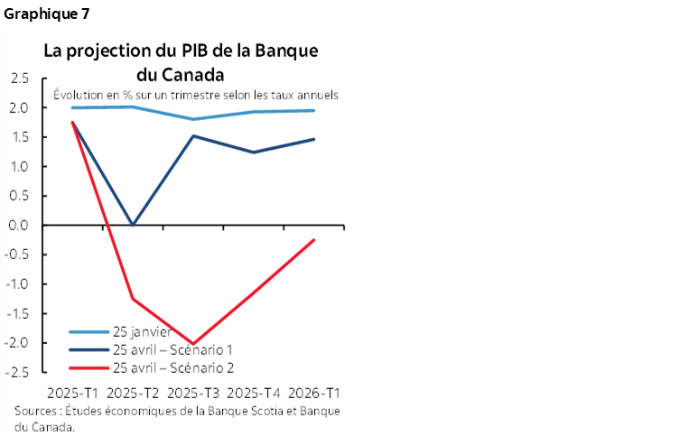 7. On attend toujours des précisions sur la nature et le moment des prochaines prévisions. La BdC a renoncé à livrer des prévisions il y a six semaines en privilégiant deux scénarios et un haussement d’épaules. Je ne peux m’imaginer qu’elle aura plus confiance dans ce qu’il faut prévoir et dans la ligne de conduite à tenir à terme. Avant tout, je crois que l’incertitude est plus grande aujourd’hui en raison du conflit qui oppose les tribunaux et l’administration américaine, ainsi que du dénouement de ce conflit. La BdC n’a pas à décider si elle doit ou non publier ses prévisions d’ici la diffusion de son RPM à la fin du mois de juillet. Pour l’heure, la patience est de rigueur. Si la BdC abaisse le taux directeur, elle n’aura pas de structure‑cadre pour justifier sa décision.