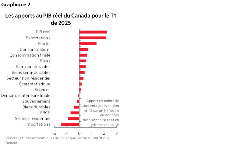 Le graphique 2 fait état des apports pondérés à la croissance du PIB du T2 par catégorie de dépenses. Les détails ne sont pas exceptionnels; ils ne sont pas terribles non plus. Les stocks ont rehaussé de 1,4 point de pourcentage la croissance du PIB du T1 parce que les entreprises ont thésaurisé du fait de la menace tarifaire qui plane sur les chaînes logistiques. À elle seule, cette raison ne justifie pas le ralentissement du rythme du T1 sans aussi tenir compte du fait que les importations ont compensé en retranchant 1,4 point de pourcentage sur la croissance du PIB du T1, puisque le surcroît des stocks a été probablement fortement attribuable à la hausse des importations. Les exportations ont fortement rehaussé la croissance de 2,2 points de pourcentage parce que les exportateurs ont probablement tâché de livrer leurs produits sur les marchés avant l’imposition des tarifs douaniers. En définitive, la consommation est venue ajouter 0,7 point de pourcentage à la croissance du PIB du T1, essentiellement par l’entremise des biens semi‑durables, l’investissement résidentiel a rogné 0,9 point de pourcentage sur la croissance, l’investissement dans les structures non résidentielles a soustrait 0,4 point de pourcentage, et l’investissement dans la machinerie et l’équipement a rehaussé la croissance de 0,7 point de pourcentage. Les dépenses de l’État ont arraché 0,1 point de pourcentage au PIB du T1.