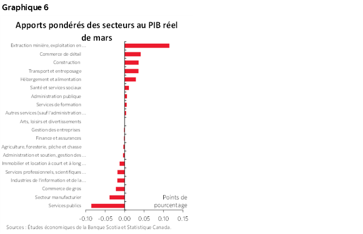 À +0,1 % sur un mois, le PIB de mars correspond à la précédente estimation éclair de Statistique Canada. Le graphique 6 fait état des apports par secteur. À mon avis, l’économie a été plus solide que le chiffre de synthèse du PIB pour mars, puisque le secteur des services publics a rogné un dixième de point sur la croissance, ce qui correspond plus que n’importe quoi d’autre à un bulletin météorologique volatil.