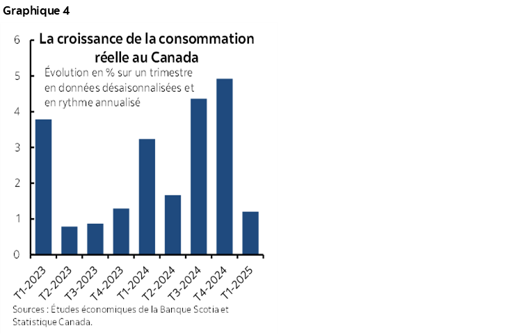 La consommation, même si elle n’a pas été prodigieuse, a quand même gagné 1,2 % sur un trimestre en données désaisonnalisées et annualisées, pour un apport de 0,65 point de pourcentage à la croissance du PIB du T1 en chiffres pondérés. Il est compréhensible que le PIB reprenne un peu son souffle après avoir inscrit des rythmes de croissance effrénés au T3 et au T4 l’an dernier, et honnêtement, il s’agit d’un progrès puisqu’après avoir inscrit un taux de croissance de 5 % au T4, le PIB ne s’est pas replié au T1 (graphique 4). Or, le relèvement de la croissance comporte d’importants risques prospectifs.