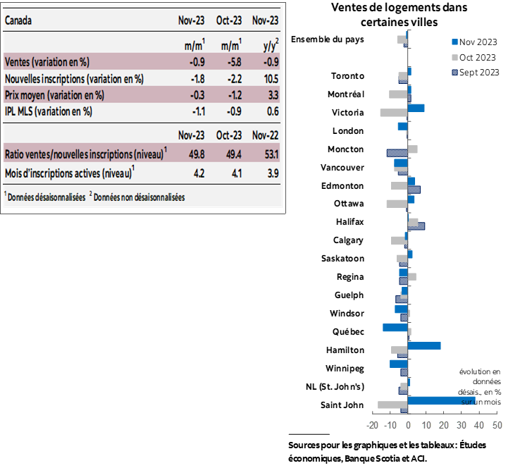 En novembre, les ventes de logements au Canada ont perdu 0,9 % (en données désaisonnalisées sur un mois). Les nouvelles inscriptions ont emboîté le pas, en doublant ce recul (1,8 %). Cette baisse plus importante des inscriptions par rapport aux ventes ne fait que durcir légèrement le ratio des ventes sur les nouvelles inscriptions, indicateur de la tension du marché, qui est resté à un creux depuis 10 ans. Ce ratio s’inscrit aujourd’hui à 49,8 %, ce qui est nettement inférieur à son récent pic d’avril, soit 68,3 % (sans oublier son pic de plus de 80 % en janvier 2022) et ce qui est moindre que sa moyenne à long terme de 55,2 %. Ce léger durcissement a quand même fait rebasculer le marché national en territoire équilibré. Le marché comptabilise 4,2 mois d’inventaire — contre 3,1 en mai; il reste toutefois inférieur à sa moyenne à long terme, de l’ordre de 5 mois. Dans les provinces de l’Atlantique, les mois d’inventaire sont compris entre 4 et 6 mois de moins que les moyennes à long terme de cette région.