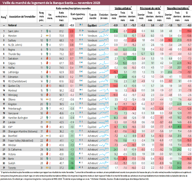 On relève une répartition presque égale entre les marchés dont les ventes ont augmenté et ceux dont les ventes n’ont pas progressé. Les ventes ont décollé dans 16 des 31 marchés que nous suivons, n’ont pas bougé dans deux marchés et ont baissé dans les autres. Il faut signaler les hausses dans les deux chiffres, de 14 % et plus, sur les marchés de l’Ontario, dont Peterborough, Barrie, Hamilton-Burlington et St. Catherines, ce dernier marché ayant progressé de plus de 24 %, alors que Saint John a couronné le palmarès du mois, avec une hausse de près de 38 %. Ces hausses ont été entièrement effacées par les baisses moindres (14 % et moins) dans les grands marchés comme Québec, Winnipeg, Kitchener-Waterloo, Okanagan-Mainline, la vallée du Fraser et Vancouver. En novembre, le niveau des ventes a accusé une baisse de 14 % sur le niveau moyen de 2010-2019 observé pour ce mois.