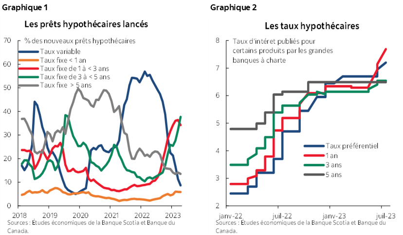 La hausse de juin, intervenue dans la première semaine du mois, avait donc eu le temps d’influer sur les décisions des acheteurs et sur les résultats du mois du fait de la hausse des coûts du crédit. Si les taux variables ont augmenté directement en fonction du taux préférentiel, les prêts hypothécaires à taux variable représentent la part la plus faible des prêts hypothécaires lancés à l’heure actuelle, après avoir atteint un pic au début de l’an dernier. Il semble que ce soit la hausse des taux fixes à court terme, qui ont augmenté en juin en raison de l’impact direct de l’augmentation du taux directeur, mais aussi à cause du durcissement du discours de la BdC, qui laissait la porte ouverte à une hausse en juillet, alors qu’on s’attendait à des baisses prochaines de taux, semblent avoir produit l’impact le plus important. Les produits hypothécaires à taux fixe et à court terme sont de plus en plus populaires récemment, ce qui s’explique par le basculement des préférences des acheteurs, qui tablent sur une plus grande certitude en période d’incertitude (graphiques 1 et 2).