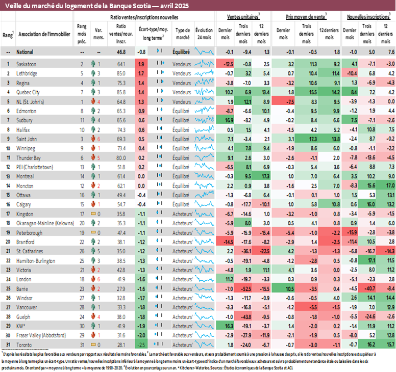 En avril, les ventes ont fléchi dans un peu plus de 60 % des marchés que nous suivons, alors que les nouvelles inscriptions ont baissé dans plus de 70 % de ces marchés. Le ratio des ventes sur les nouvelles inscriptions s’est assoupli (a baissé) dans 45 % de ces marchés. Il y a aujourd’hui 15 de ces marchés dont la conjoncture est favorable aux acheteurs contre seulement quatre en décembre 2024.