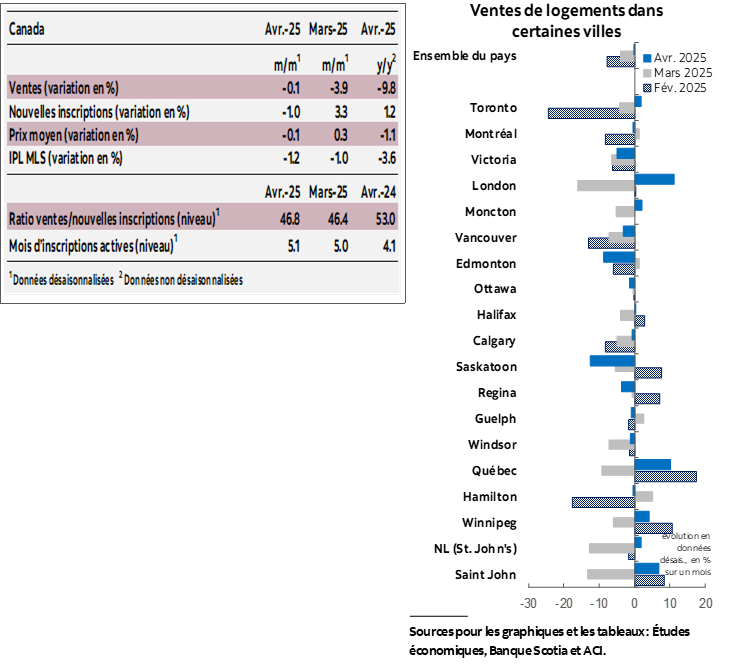Les ventes nationales de logements en avril par rapport à mars sont restées relativement stables; elles ont légèrement baissé (‑0,1 % en chiffres désaisonnalisés), en mettant quasiment fin à leur recul constant depuis novembre 2024 (en accusant une baisse cumulative de 19,2 %), à l’époque où la prochaine administration américaine a clairement précisé que les importations du Canada et d’autres pays seraient soumises à des tarifs élevés, pour ensuite enchaîner avec cette intention affirmée. En avril, les ventes se sont chiffrées à presque 18 % de moins que leur niveau moyen pour la période de 2015 à 2024. Les ventes nationales ont perdu ‑9,8 % en avril (en chiffres non désaisonnalisés) par rapport à leur niveau du même mois en 2024.