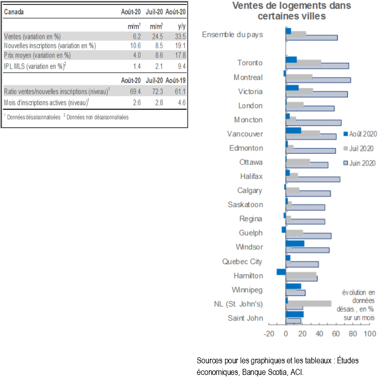 Grâce à un gain de 6,2 % (en données désaisonnalisées sur un mois), les ventes de logements au Canada ont atteint un nouveau sommet absolu en août 2020, en misant sur les pics sans précédent de juillet. Ainsi, les achats se sont établis à 20 % de plus qu’en février — soit le dernier mois avant l’entrée en vigueur des mesures de confinement à cause de la COVID-19. Les ventes ont dépassé les sommets prépandémiques dans 28 des 31 villes pour lesquelles nous recensons des données; 10 villes ont atteint des niveaux record. Les nouvelles inscriptions ont inscrit un vigoureux bond de 10,6 % (en données désaisonnalisées sur un mois) pour abaisser à 69 % le ratio national des ventes par rapport aux nouvelles inscriptions — ce qui est toujours très révélateur de la conjoncture de l’offre et de la demande, favorable aux vendeurs. Les inscriptions se sont établies à 17 % de plus que les niveaux prépandémiques d’un océan à l’autre et sont entièrement sorties de convalescence dans la majorité des villes. Énergisé par ce durcissement, l’indice composé des prix des propriétés (IPP) MLS a monté de 9,4 % (en chiffres non désaisonnalisés sur un an), pour enregistrer son gain le plus prononcé depuis 2017.