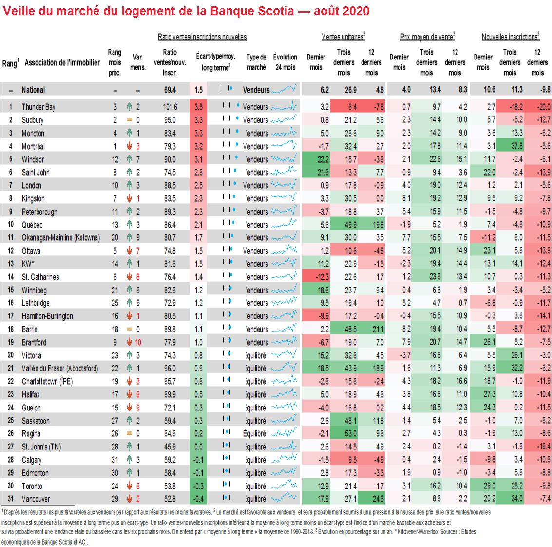 En août, le rattrapage dans les nouvelles inscriptions laisse entendre qu’il y aura encore de modestes gains de prix dans les prochains mois. Dans le mois précédent, nous avions signalé que les ventes s’étaient d’abord rétablies plus rapidement que les nouvelles inscriptions dans différentes agglomérations, ce qui avait donné lieu à certains déséquilibres entre l’offre et la demande. Bien que ces mouvements initiaux paraissent toujours étayer les prix, le bond des inscriptions du mois précédent — qu’il s’agisse d’un simple redressement de l’offre pour réagir à la vigueur de la demande ou d’un effet du stress des ménages — mérite plus d’attention : par contre, des hausses parallèles des ventes et des inscriptions dans le Sud de la Colombie-Britannique et dans le GGH laissent entendre que l’offre limitée avait tenu en laisse les achats de logements existants. Dans ces régions, les autres gains de l’offre pourraient étayer l’activité des ventes dans les prochains mois.