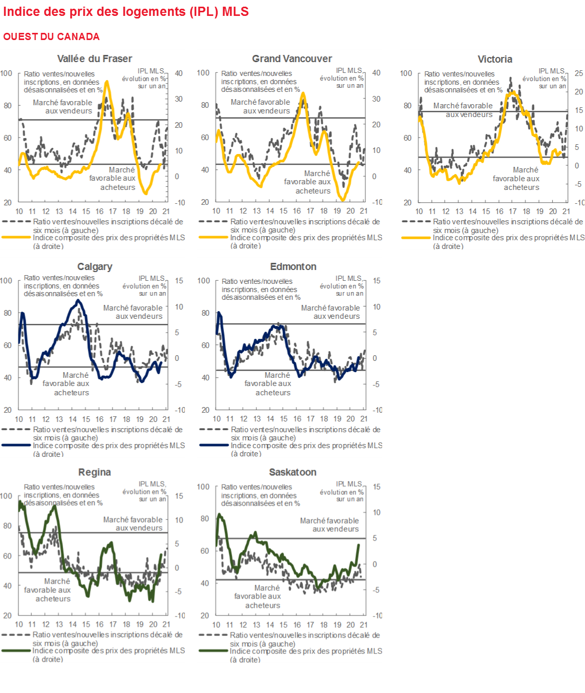 Montréal et Ottawa ont elles aussi comptabilisé des hausses de leurs inscriptions supérieures à la croissance des achats de logements; dans l’ensemble des provinces de l’Atlantique, les mouvements ont été comparables. Toutefois, en raison des déséquilibres entre la demande et l’offre avant la pandémie, exacerbés pendant le déconfinement, Montréal a comptabilisé sa plus forte hausse, depuis 2003, de l’IPP MLS repère en chiffres non désaisonnalisés sur un an. Dans le même temps, la progression de l’IPP MLS repère d’Ottawa a frôlé les 20 %, et à Moncton, il a inscrit une poussée de plus de 12 % (dans les deux cas, en chiffres non désaisonnalisés sur un an); il s’agit de records pour ces deux villes.