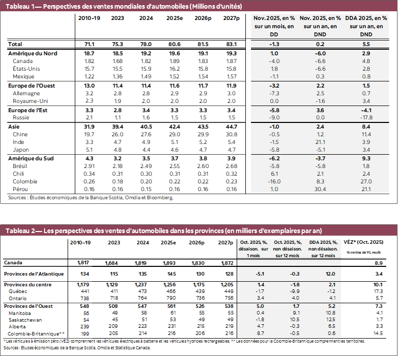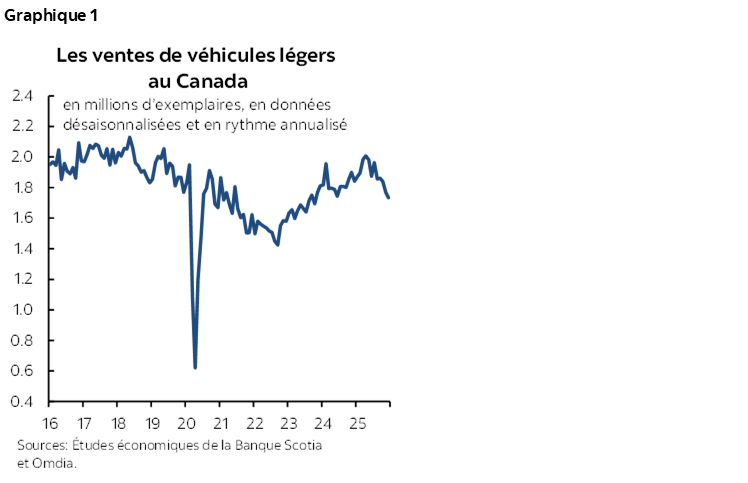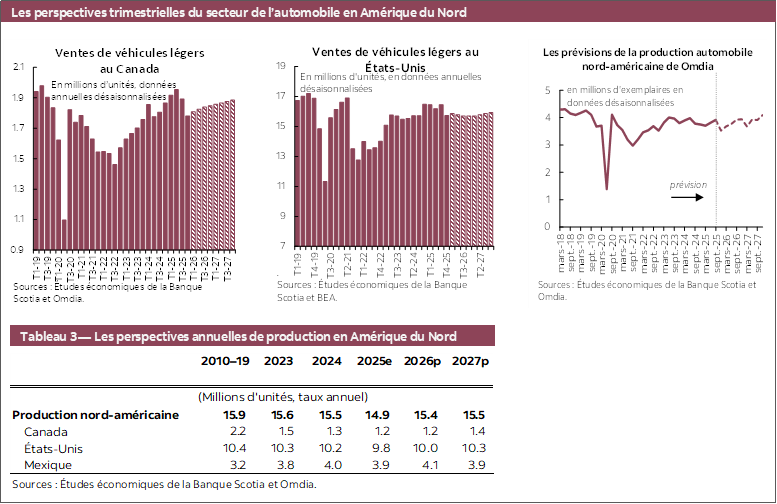 Pendant une grande partie de 2025, les statistiques économiques ont été plus résilientes que ce que l’on craignait au printemps. La croissance de l’emploi a recommencé à s’accélérer à l’automne, pour se chiffrer à une moyenne de 42 800 postes au quatrième trimestre; le taux de chômage, à 6,8 %, n’a pas varié par rapport à l’année précédente. Nous nous attendons à ce que la Banque du Canada temporise, en maintenant le taux directeur à 2,25 % : elle prendra la mesure de l’évolution de l’économie et de l’impact subséquent sur les perspectives inflationnistes, et sa prochaine intervention consistera probablement à hausser ce taux dans le deuxième semestre de 2026. C’est pourquoi il est improbable que dans le court terme, les coûts du crédit pour les consommateurs et les entreprises baissent encore plus; ils pourraient en fait augmenter sur le moyen terme. Pour les ventes de véhicules légers au Canada, nos prévisions s’établissent à 1,83 million d’exemplaires en 2026, puisque nous nous attendons à ce que le rythme des ventes rebondisse après avoir récemment accusé des baisses, même si elles ne se situent pas au même niveau que le printemps dernier, et à ce qu’il augmente pour s’inscrire à 1,87 million d’exemplaires en 2027.