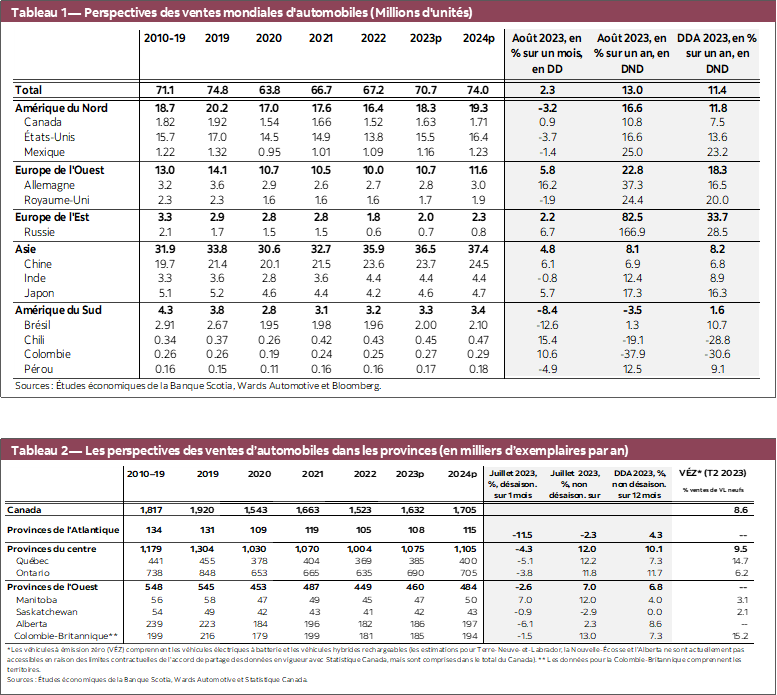 En août, les ventes d’automobiles mondiales ont été contrastées parmi les différentes régions; toutefois, elles ont progressé en chiffres nets de 2,3 % sur un mois (en données désaisonnalisées) (graphique 1). Les ventes de véhicules ont généralement augmenté dans la région de l’Asie‑Pacifique (4,8 % sur un mois, en données désaisonnalisées) parce que la progression des ventes en Chine (6,1 %) et au Japon (5,7 %) a largement masqué les baisses comptabilisées en Inde (‑0,8 %) et en Indonésie (‑6,7 %), même si la progression s’est ralentie dans les derniers mois. En Europe de l’Ouest, les ventes d’automobiles ont bondi de 5,8 % sur un mois (en données désaisonnalisées) : elles ont augmenté dans 10 des 15 pays couverts et inscrit des hausses remarquables en France (5,9 %), en Allemagne (16,2 %) et en Italie (3,0 %), même si elles ont baissé au Royaume-Uni (‑1,9 %), alors que les ventes dans l’ensemble de la région sont restées stables dans les derniers mois sur une moyenne mobile de trois mois. Dans le même temps, en Amérique latine, les ventes automobiles ont plongé de 6,4 % sur un mois (en données désaisonnalisées) après avoir enchaîné trois mois consécutifs de croissance; elles se sont contractées en Argentine (‑7,2 %), au Brésil (‑12,6 %), au Mexique (‑1,4 %) et au Pérou (‑4,9 %), alors qu’elles ont augmenté au Chili (15,4 %) et en Colombie (10,6 %), en inversant partiellement le ralentissement des ventes des deux mois précédents. D’après nos prévisions, les ventes mondiales automobiles progressent de 5,2 % en 2023 et devraient augmenter de 4,6 % en 2024 (graphique 2).