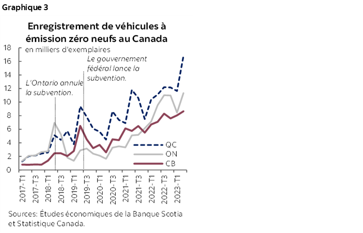 Il y a encore énormément de progrès à accomplir dans la réalisation des objectifs du Canada dans la vente des véhicules zéro émission (VZE). Les ventes récentes de véhicules électriques (VE) au Canada en pourcentage de l’ensemble des immatriculations de véhicules automobiles nouvelles sont restées stables, à 8,6 % au T2 et au S1 de 2023, ce qui n’a presque pas bougé depuis le T3 de 2022 (8,7 %). Le premier objectif provisoire du Canada fixe une exigence d’une part d’au moins 20 % de VZE dans les ventes de nouveaux véhicules utilitaires légers d’ici 2026 et représente une étape dans la réalisation de l’objectif de ventes constituées à 100 % de VZE d’ici 2035. Pour atteindre ce premier objectif provisoire, il faudrait que les ventes de VE doublent par rapport au chiffre comptabilisé dans les quatre trimestres clos au T2 de 2023, en veillant à ce que le total des ventes ne change pas. En Ontario, qui constitue le premier marché provincial du Canada pour les ventes totales de véhicules, seulement 6,2 % des nouvelles immatriculations de véhicules automobiles ont porté sur des VE, même si ces véhicules représentent plus d’un véhicule sur quatre (28,2 %) des ventes nationales de VE (graphique 3). Par contre, un peu plus de deux nouveaux VE sur cinq (41,7 %) ont été immatriculés au Québec, deuxième grand marché pour le volume, ce qui représente 14,7 % du total des véhicules neufs vendus dans cette province. Dans le même temps, parmi tous les nouveaux VE, un véhicule sur cinq (21,5 %) a été immatriculé en Colombie‑Britannique, ce qui représente 15,2 % des nouveaux véhicules automobiles immatriculés dans cette province et qui explique que la Colombie‑Britannique soit la province qui est la plus proche d’atteindre le premier objectif provisoire des ventes au Canada. L’abordabilité des véhicules continuera probablement de faire souffler des vents contraires sur les ventes de VE au Canada à court terme; or, elle risque de constituer une contrainte majeure, comme nous l’avons vu dans un récent rapport des Études économiques de la Banque Scotia. Si les taux de financement élevés sont appelés à faire souffler des vents contraires, à court terme, sur les ventes de VE, le maintien du statu quo dans la production des véhicules que les consommateurs veulent aujourd’hui pourrait limiter l’abordabilité des VZE et augmente le risque de ne pas réaliser les objectifs de porter les ventes de VZE à 100 % des véhicules dans un peu plus d’une dizaine d’années.