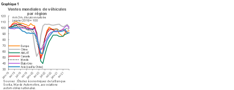 - Au mitan de 2021, les ventes mondiales d’automobiles se rapprochaient des niveaux atteints avant la pandémie, surtout grâce aux États-Unis et à la Chine, pays dans lesquels les ventes annualisées du deuxième trimestre ont été supérieures aux niveaux atteints à la fin de 2019 (graphique 1).