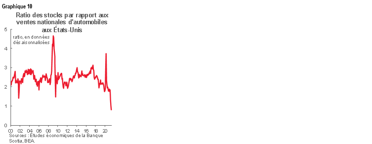 C’est dans les concessions automobiles que la pénurie est le plus évidente. Les niveaux de stocks en pourcentage des ventes aux États-Unis ont été inférieurs à un pour la première fois dans les annales en mai (graphique 10). Selon Wards Automotive, le nombre de jours d’épuisement des stocks (soit le délai dans lequel on est à court de stock) s’est inscrit à 27 jours à peine en juin — soit la moitié de ce qu’il était il y a un an, ce qui est nettement inférieur à la moyenne prépandémique de 67 jours pour juin. De même, le nombre de jours d’épuisement des stocks au Canada continue d’évoluer tendanciellement en baisse en date de juin, et il n’y a toujours encore aucun signe que la situation bascule. Sans surprise, une enquête statistique de la Corporation des associations de détaillants d’automobiles nous apprend que 91 % des concessionnaires s’inquiètent des pénuries de stocks.