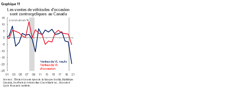 La pénurie de l’offre sur le marché des véhicules d’occasion est encore plus aiguë à l’heure où la demande s’intensifie. Les ventes de véhicules neufs et de véhicules d’occasion ont tendance à être contrecycliques aux États-Unis et au Canada, puisque la demande bascule sur les marchés des véhicules d’occasion plus abordables dans la foulée des revirements économiques (graphique 11). Dans cette ère pandémique, les craintes qui pèsent sur les transports en commun ont sans doute stimulé la demande nouvelle exprimée pour les véhicules d’occasion par les ménages à revenus moindres, alors que les pénuries de véhicules neufs ont probablement redirigé une partie de la demande vers ce marché, qui représente généralement 70 % du total des ventes de véhicules aux États-Unis (et 60 % au Canada). Les mesures d’aide officielle exceptionnelles ont probablement faussé la contrecyclicité importante cette année, puisque les deux marchés ont profité de la vigueur de la demande.