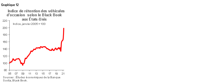 On peut dire, dans le meilleur des cas, que les prix des véhicules d’occasion sont « étranges ». En théorie, on pourrait vendre aujourd’hui un véhicule très demandé, de un an ou deux ans, à un prix supérieur à celui affiché à l’origine. Black Book fait savoir que les prix de détail au début de juillet ont augmenté d’environ 25 % depuis janvier seulement (alors que les stocks ont baissé de 10 %) aux États-Unis. Proportionnellement, les prix de gros — mesurés selon les indices de rétention — continuent d’atteindre des sommets sans précédent de part et d’autre de la frontière (graphique 12). En somme, tant que le coût de remplacement des véhicules quasi neufs continue de bondir, le potentiel d’arbitrage est essentiellement théorique. La situation met plutôt en lumière les limites imposées dans la maximisation des profits s’il n’y a tout simplement pas de stocks à vendre.