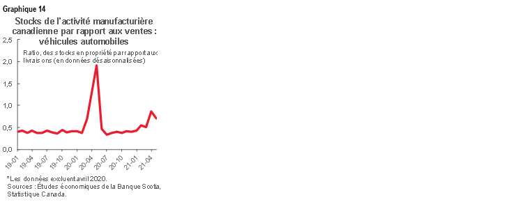 Des signes permettent de croire que les goulets d’étranglement de la production sont en train de sortir du creux de la vague. En juin, la production de véhicules aux États-Unis a pris un peu de mieux en gagnant 2,5 % sur un mois (en données désaisonnalisées), à un rythme de production annualisé de 14,1 millions d’exemplaires, après avoir reculé chaque mois depuis mars, selon Wards Automotive. Par ailleurs, un examen des niveaux de stocks dans la chaîne de valorisation devrait nous donner une idée de l’orientation de l’offre; or, en réalité, le décalage de ces données limite leur utilisé dans ce contexte. Au Canada, les stocks de véhicules automobiles au détail en pourcentage des ventes se sont légèrement détériorés au premier trimestre de 2021, ce que l’on constate généralement aujourd’hui, même si le décalage de la production par rapport à la vente au détail peut être informatif. Les stocks de gros plus ponctuels (mais toujours décalés) dans les véhicules automobiles et les pièces détachées au Canada ont déjà inscrit en mai un gain de 3,6 % sur un mois, ce qui pourrait vouloir dire que les véhicules ont commencé à progresser dans la chaîne logistique. En remontant plus loin dans le temps dans la chaîne logistique, les stocks manufacturiers des véhicules automobiles en pourcentage des livraisons ont eux aussi basculé en mai (graphique 14), ce qui est une autre bonne nouvelle. Or, les statistiques d’un mois ne font pas encore une tendance, et les niveaux sont loin de l’équilibre.