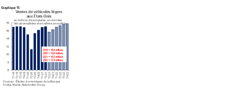 Nous nous attendons à ce que la léthargie des stocks continue de contraindre, durant les mois de l’été aux États-Unis et au Canada, les ventes d’automobiles. La reprise des ventes en juillet, après le creux de la vague, serait un scénario optimiste; or, il y aurait de très bonnes chances que les ventes restent déprimées en août avant que les consommateurs aient plus de choix dans les concessions automobiles. Pour les États-Unis, nous avons prudemment comptabilisé les ventes à un niveau annualisé de 15,6 millions d’exemplaires au troisième trimestre, ce qui représente un brusque repli de 8 % sur un trimestre par rapport au rythme effréné des ventes au deuxième trimestre à 17 millions d’exemplaires annualisés malgré la piètre performance de juin. Les ventes devraient reprendre un peu de mieux dans les trimestres qui suivront, pour finir l’année à 16,4 millions d’exemplaires et à 17,4 millions d’exemplaires respectivement en 2021 et 2022 (graphique 15).