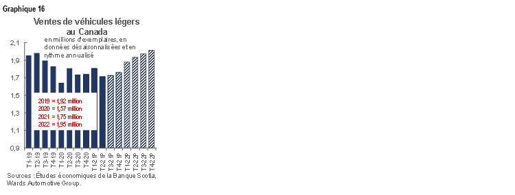 Au nord de la frontière, le profil trimestriel est légèrement différent. Alors que les États-Unis ont inscrit, en avril et en mai, des ventes mensuelles phénoménales, les ventes au Canada ont été anémiques au début du printemps en raison des confinements plus rigoureux pendant les troisièmes vagues, ce qui a probablement douché l’enthousiasme des consommateurs. (En Ontario, les ventes nettement plus atoniques dans ces mois étayent cette analyse, puisque les confinements ont été relativement plus longs et plus rigoureux.) Par conséquent, au deuxième trimestre au Canada, les ventes se sont nettement ralenties (de 5 % sur un trimestre, en données désaisonnalisées), pour atteindre un rythme annualisé de 1,7 million d’exemplaires. Nous nous attendons à ce qu’au troisième trimestre, les ventes soient essentiellement étales et à ce qu’elles ne se ressaisissent que légèrement au quatrième trimestre. Nous nous attendons à ce que les ventes s’établissent à 1,75 million d’exemplaires en 2021 et à 1,95 million d’exemplaires en 2022 (graphique 16).