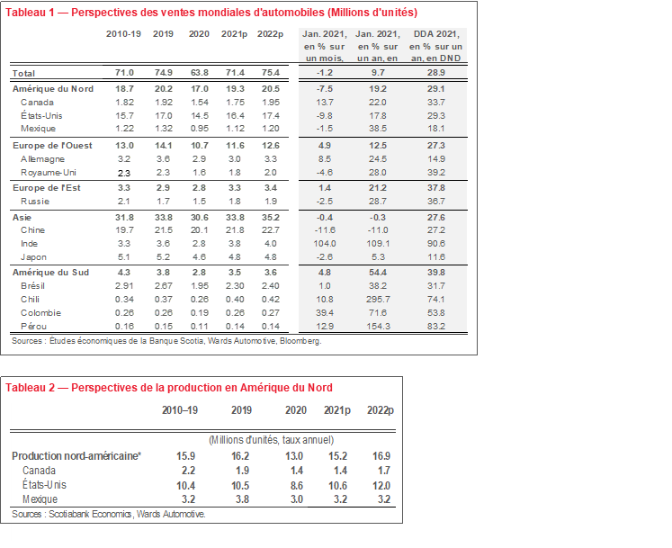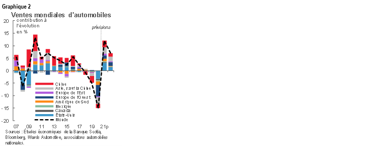 Les difficultés de reconstitution des stocks en raison de la pénurie mondiale de semi-conducteurs devraient tempérer la reprise soutenue jusqu’à la fin de 2021. Il est probable que les ventes du troisième trimestre se replient légèrement après un deuxième trimestre relativement anémique, puisque les stocks devraient rester faibles pour la plus grande partie de l’été dans de nombreux marchés majeurs, et encore plus aux États-Unis et au Canada. Il n’empêche que nous nous attendons à ce que les ventes mondiales d’automobiles inscrivent un vigoureux gain de 12 % sur un an (à 71,5 millions d’exemplaires) en 2021, après une calamiteuse contraction sur un an de 15 % l’an dernier (graphique 2).