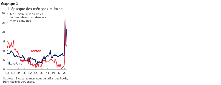 Les ménages ont empoché une partie de la manne produite jusqu’à maintenant par la pandémie. Au Canada comme aux États-Unis, les taux d’épargne des ménages ont culminé à presque 30 % du revenu disponible l’an dernier (graphique 3). L’amenuisement des craintes précautionnaires et l’allégement des restrictions ont abaissé les taux d’épargne par rapport à ces pics; or, l’épargne est toujours aussi élevée (et a en fait même rebondi aux États-Unis dans la foulée du dernier cycle de chèques d’aide). Cette épargne devrait continuer de nourrir la reprise qui se poursuit. Par exemple, la Banque du Canada suppose prudemment que les Canadiens dépenseront, en 2022 et 2023, 20 % de l’épargne ainsi cumulée.
