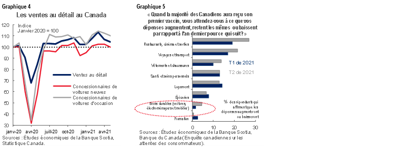 Jusqu’à maintenant, ce sont les biens durables qui ont le plus profité de cette reprise menée par les consommateurs : les secteurs de services à « contacts rapprochés » commencent à peine à reprendre des couleurs. Aux États-Unis, les ventes au détail de juin se sont inscrites à 18 % de plus que les niveaux prépandémiques; les composants spécifiques des biens portent ces gains. Même s’il s’est fait un peu plus discret, le rebond du commerce de détail au Canada suit des tendances comparables. Les ventes au détail du Canada, dont les véhicules automobiles et les pièces détachées représentent environ le quart, se déroulent en suivant généralement la reprise du commerce de détail : les ventes de véhicules d’occasion s’illustrent (avec l’aide des effets de prix) et les ventes de véhicules neufs sont légèrement amoindries (graphique 4). Bien qu’on doive toujours attendre pour savoir comment les consommateurs transformeront leurs habitudes de consommation lorsque l’économie sera entièrement déconfinée, la plus récente version de l’Enquête sur les attentes des consommateurs au Canada laisse entendre qu’il faut s’attendre à d’autres gains encore pour les biens durables par rapport aux intentions d’achat au début de l’année (graphique 5). Même si la part relative est éclipsée par la reprise dans d’autres secteurs, elle évolue tendanciellement dans la bonne direction, et un gain de 3 points de pourcentage n’est pas négligeable.
