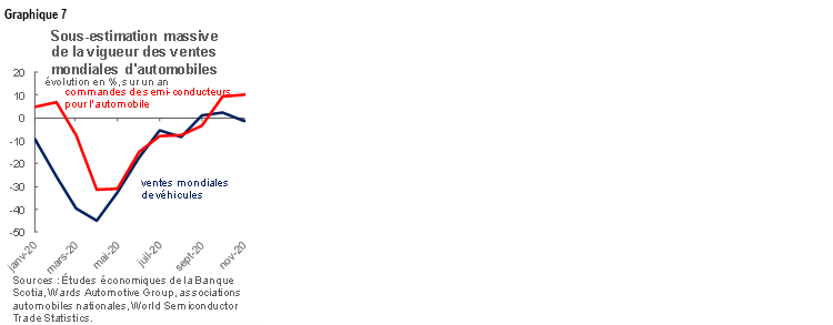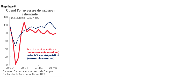 La vigueur de la demande viendra encore exacerber le déséquilibre entre l’offre et la demande qui pèse sur le secteur depuis le début de la pandémie. Avant même le choc des pénuries de semi-conducteurs au début de l’année, la production automobile avait toujours de la difficulté à prendre son élan pour inscrire un rebond plus solide qu’attendu dans la demande automobile. Les premières vagues de la COVID-19 ont paralysé la production automobile au printemps 2020 et les bouleversements de la chaîne logistique ont continué de percuter la production même après que les usines aient commencé à rouvrir leurs portes. Selon nos estimations, on a produit l’an dernier en Amérique du Nord 4 millions de véhicules de moins par rapport à nos prévisions prépandémiques, alors que les ventes ont chuté d’« à peine » 3 millions d’exemplaires. Bien que les données ne soient pas comparables, cette première discordance de l’offre et de la demande permet de constater que l’offre accusait déjà du retard sur la reprise au tournant de 2021 (graphique 6).