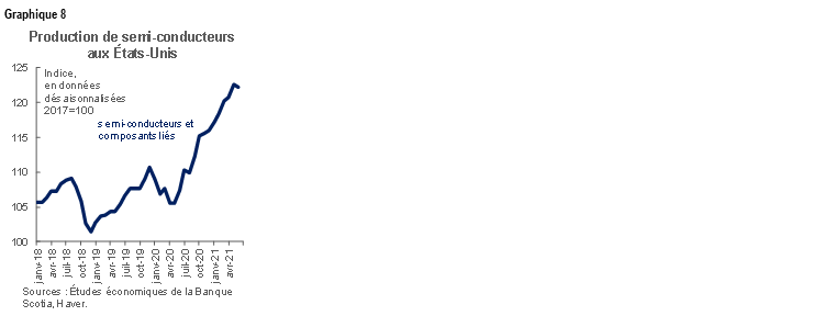 La production de semi-conducteurs continue de prendre du mieux. Depuis le début de l’année, la croissance des ventes de semi-conducteurs aux États-Unis s’inscrivait à 26 % sur un an en mai, selon la Semiconductor Industry Association, et la production américaine continue de s’accélérer en juin (graphique 8). Le secteur doit encore s’adapter à un investissement de 52 G$ US du président Biden, ainsi qu’aux pourparlers stratégiques à propos de l’offre avec le Japon et la Corée du Sud. Dans le même temps, l’un des plus grands producteurs de semi-conducteurs —TSMC de Taïwan — a rassuré les marchés en déclarant que les pénuries de semi-conducteurs destinés à l’automobile devraient s’amoindrir au troisième trimestre cette année. Ce producteur s’attend à ce que la production de ses unités de microcontrôleurs (élément essentiel pour les véhicules) augmente de 60 % en 2021, alors qu’elle a déjà gagné 30 % dans le premier semestre cette année.