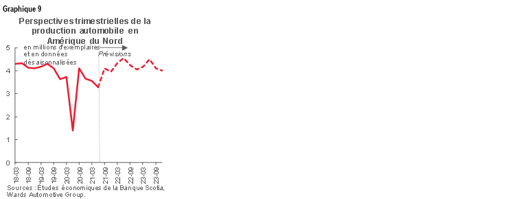 On s’attend à un revirement de la situation durant ce trimestre. Wards Automotive prévoit, au troisième trimestre, une accélération de l’ordre de 13 % sur un trimestre (en données désaisonnalisées), puisque les livraisons de semi-conducteurs s’accéléreront et que les producteurs automobiles relèveront leur capacité. Ce rebond devrait se poursuivre durant le dernier trimestre de 2021. Or, la production à la fin de l’année atteindrait 15,9 millions d’exemplaires en Amérique du Nord, ce qui représente toujours 5 % de moins que les niveaux de production de véhicules en 2019 — et presque 10 % de moins que les prévisions de production avant la pandémie (graphique 9). Puisque les constructeurs automobiles révisent leurs prévisions sur la base d’une haute fréquence (la dernière grande révision en baisse a été apportée il y a quelques semaines à peine), ce pronostic comporte un risque substantiel et laisse une marge de manœuvre de plus en plus limitée quand il s’agit de compenser la capacité perdue à mesure que l’année progresse.