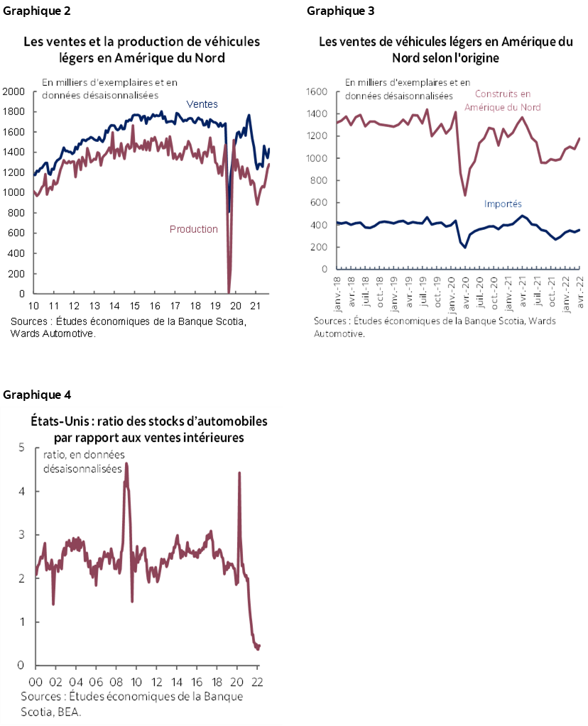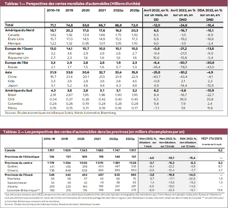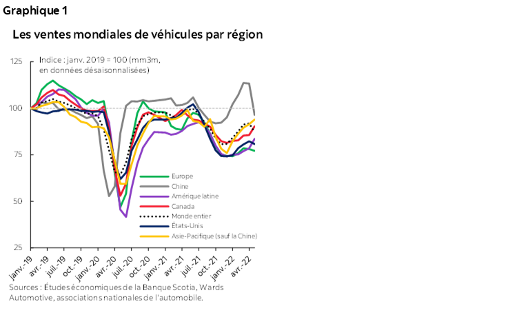 Pour l’heure, les blocages semblent relativement circonscrits hors de ces régions, puisque la reprise bat toujours son plein ailleurs en Asie et dans les Amériques. L’Amérique du Nord a mené la reprise grâce à un solide rebond de 6,5 % sur un mois (en données désaisonnalisées) en avril, à 17,2 millions d’exemplaires en données désaisonnalisées et en rythme annualisé, ce qui a ramené à ‑16,7 % le déficit sur un an. L’Amérique du Sud a aussi inscrit un gain comparable de 6,2 % sur un mois (en données désaisonnalisées), porté par des améliorations au Brésil, au Chili et en Colombie (8,4 % sur un mois, 6,5 % sur un mois et 9,8 % sur un mois respectivement). En excluant la Chine, l’Asie‑Pacifique a comptabilisé une hausse de 2,9 % sur un mois (en données désaisonnalisées) en avril alors que les ventes continuent de prendre du mieux au Japon (4,9 % sur un mois en données désaisonnalisées). Dans l’ensemble, la reprise est probablement lente et cahoteuse, puisque les blocages de l’offre mondiale ne semblent pas vouloir s’apaiser considérablement, alors que le choc chronique de la pression sur les prix et les prix élevés de l’énergie représentent plus de risques de baisse pour la demande partout dans le monde.