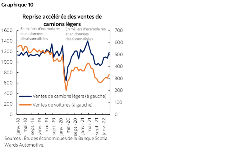 Les contraintes de l’offre limitent probablement la préférence des consommateurs pour l’économie de carburant dans un environnement de flambée des prix de l’essence. Les achats de camions légers (soit les VUS, les camionnettes et les fourgonnettes) ont accusé une perte moindre en raison de la pénurie de semi‑conducteurs, et la rapidité de la reprise continue de surclasser celle des voitures malgré les récents pics des prix de l’essence (graphique 10). Puisque les stocks reprennent plus rapidement du mieux pour les camions légers que pour les petites voitures — ces dernières étant généralement plus économes de carburant —, les prix élevés de l’essence dans les derniers mois n’ont pas conduit à un repli des ventes de camions en chiffres relatifs. Puisqu’on s’attend à ce que les prix de l’essence continuent d’être élevés, les consommateurs pourraient se tourner vers les véhicules électriques (comme le confirment plusieurs sondages récents, en cliquant sur ce lien, cet autre lien et ce troisième lien), même si un basculement à grande échelle est improbable cette année, compte tenu de la rareté de l’offre, surtout les modèles abordables.