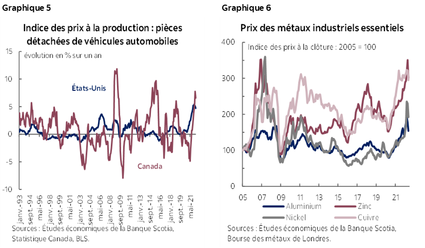 Les constructeurs automobiles sont aux prises avec des coûts de production qui montent en flèche et qui seront probablement répercutés sur les consommateurs. La croissance des prix des producteurs pour les pièces détachées de véhicules automobiles s’accélère aux États‑Unis comme au Canada, en raison de la hausse des prix des matières premières et des coûts de l’énergie (graphique 5). Les prix des métaux essentiels (dont l’acier, l’aluminium, le cuivre et le nickel) ont commencé à fléchir en avril en raison de la baisse de la demande chinoise (graphique 6), ce qui pourrait éventuellement permettre aux constructeurs de reprendre leur souffle à court terme. Même s’ils se sont repliés depuis les pics d’octobre 2021, les frais mondiaux d’expédition — suivis grâce à l’indice Baltic Dry — pourraient continuer de rester élevés d’ici la fin de l’année. Parce que les blocages de la chaîne logistique mondiale ont multiplié la pression exercée par les risques géopolitiques (d’après l’indice des pressions sur les chaînes logistiques mondiales estimé par la Banque de réserve fédérale de New York), les coûts de production sont appelés à rester élevés, et les constructeurs automobiles pourraient les répercuter sur les consommateurs en haussant les prix et en réduisant les dépenses consacrées aux programmes d’incitation.