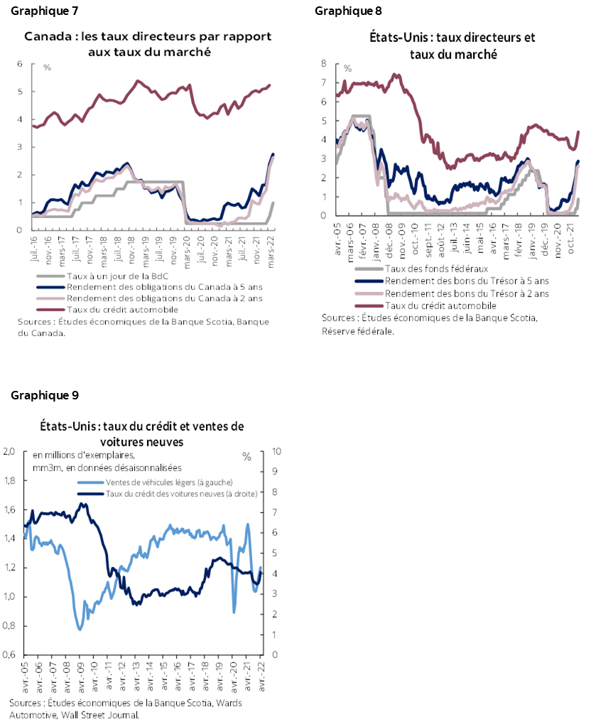 Les marchés ont intégré l’essentiel des hausses de taux projetées, ce qui a fait monter les frais de financement et accentué les difficultés dans l’abordabilité. Au Canada, les taux moyens des prêts pour les voitures neuves ont encore augmenté depuis mars, et on s’attend à un vigoureux parcours dans la hausse des taux, de l’ordre de 85 points de base depuis juin dernier (graphique 7), ce qui se rapproche des niveaux du début de 2019, à l’époque où le durcissement de la politique monétaire de la BdC et les risques de récession qui pointaient à l’horizon ont donné lieu à des ventes léthargiques en 2018 et 2019. Aux États‑Unis, la répercussion du durcissement de la politique monétaire sur les taux des prêts automobiles a tendance à être plus modeste et à être décalée dans le temps. Comme dans le cycle du durcissement de 2017‑2018, les taux des prêts sur les voitures neuves n’ont commencé à décoller qu’en mars et ont depuis gagné environ 70 points de base (graphique 8). L’impact du cycle de durcissement de 2017‑2018 a aussi été plus discret, aux États‑Unis qu’au Canada, pour les ventes d’automobiles (graphique 9). La hausse des frais de financement, la baisse de l’abordabilité des véhicules et les trépidations concernant les perspectives économiques viendront probablement éroder la demande dans une certaine mesure et pourraient éventuellement peser sur les achats quand l’offre se remettra à monter en 2023.
