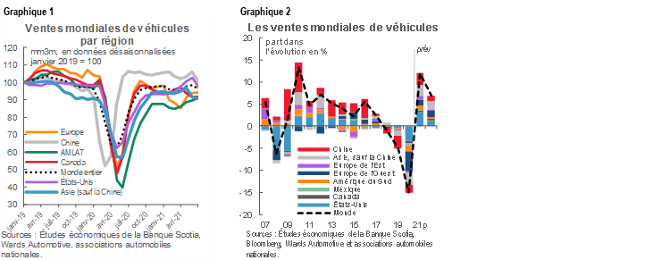 - En juillet, les ventes mondiales d’automobiles se sont de nouveau repliées (de 3 % sur un mois, en données désaisonnalisées) parce que la pénurie de semi-conducteurs a continué de faire souffler des vents contraires sur les ventes. L’Europe et l’Amérique du Nord ont porté ce repli parce que les concessionnaires ont rivalisé pour des stocks limités. Les achats chinois sont venus compenser cette baisse, grâce à un gain de 6 % sur un mois (graphique 1).