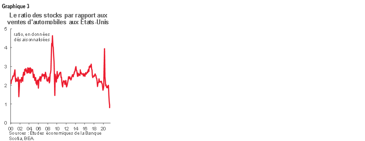 Il est raisonnable de s’attendre à ce que d’autres constructeurs automobiles annoncent en septembre de nouveaux contingents de production si le variant Delta perdure, ce qui retarderait le rétablissement des niveaux des stocks de détail, déjà plongés à des creux absolus. Le nombre de jours d’offre s’établissait à 24 au début d’août aux États-Unis (selon une fourchette normale de 60 à 65 jours), alors que les stocks (en pourcentage des ventes) s’inscrivaient à nouveau en juillet à moins de 1 (graphique 3). Même si les ventes de véhicules aux États-Unis s’affaisseront probablement encore en août, une contraction plus forte que prévu de la production ferait encore baisser les niveaux de stocks au début de septembre.