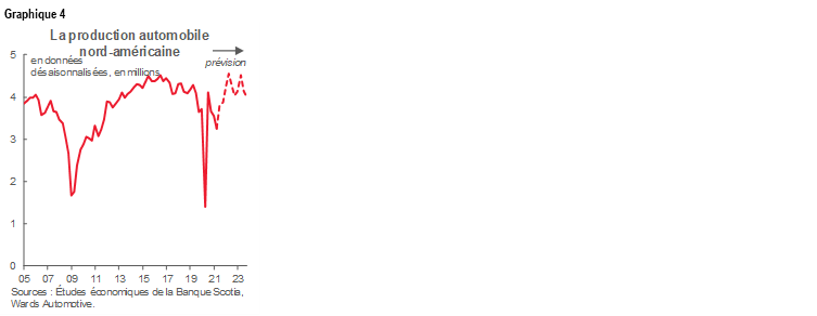 La reprise de la production plus tard à l’automne fait toujours partie des scénarios de base; or, cette conviction est très fragile. Le rebond de 15 % sur un trimestre (en données désaisonnalisées) prévu par Wards au troisième trimestre dans la production automobile nord-américaine est plus un paramètre transitoire, en attendant les autres nouvelles qu’annonceront les constructeurs, ce qui déclencherait la reprise (graphique 4). Comme nous l’avons précisé dans le rapport du mois dernier, nous ne nous attendons pas avant longtemps en 2022 à un meilleur équilibre du marché de l’offre et de la demande pour les véhicules neufs et avant encore plus longtemps pour les véhicules d’occasion.