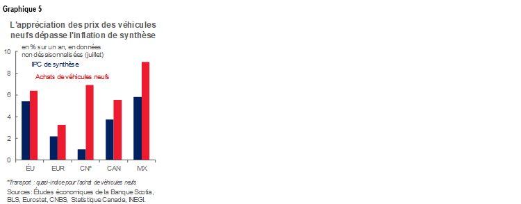Il est prématuré de s’attendre à un affaissement des prix des véhicules neufs tant qu’il n’y aura pas de décongestion des stocks. D’après J.D. Power, les prix moyens des transactions sur les véhicules neufs aux États-Unis étaient en voie d’atteindre un sommet absolu de plus de 41 k$ US — soit près de 17 % de plus qu’en juillet 2020 —, ce qui représente une hausse de 3 % sur un mois par rapport à juin 2021. Ces prix ont donné lieu en juillet à une augmentation de +1,7 % sur un mois de l’inflation des prix des véhicules neufs mesurée par l’Indice des prix à la consommation aux États-Unis. Mondialement, il s’agit de l’évolution tendancielle, et on relève des tendances comparables dans l’ensemble des marchés développés et émergents confondus; par exemple, en juillet, l’inflation des prix des véhicules neufs avoisine les 10 % sur un an au Mexique (graphique 5).