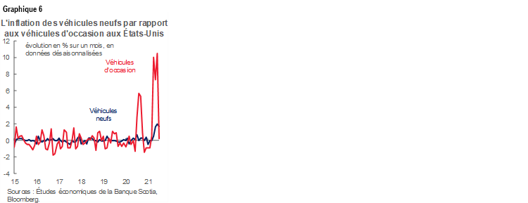 On peut dire que les stocks limités et les prix astronomiques sur les marchés des véhicules d’occasion ont neutralisé une partie du choc des prix des voitures neuves. Si, dans les dernières semaines, les prix au détail des véhicules d’occasion aux États-Unis se sont stabilisés selon le Black Book, ils s’inscrivent toujours à 24 % de plus qu’au début de l’année. En outre, l’appréciation des prix des voitures d’occasion par rapport aux prix des véhicules neufs est toujours aussi élevée, du moins aux États-Unis, lorsqu’elle est mesurée (graphique 6), ce qui milite en faveur des acheteurs potentiels de voitures neuves qui offrent d’autres voitures en échange, puisque les valeurs des échanges de juillet inscrivaient une hausse de 80 % sur les niveaux de juillet 2020 aux États-Unis, selon J.D. Power, ce qui devrait permettre de réduire les besoins en financement pour de nombreux acheteurs de véhicules neufs, qui pourront aussi compter sur des taux d’intérêt moindres. Le regain des prix de l’essence a pu saper l’abordabilité de la propriété des véhicules, ce qui ne constitue pas jusqu’à maintenant un motif de dissuasion sur les marchés dans lesquels la demande de VUS est insatiable.