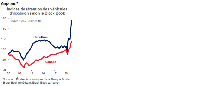 Les prix de gros des véhicules se sont modérés plus rapidement que les prix de détail. En juillet, le Black Book faisait état d’une baisse de l’appréciation hebdomadaire des prix de gros aux États-Unis et au Canada à l’heure où les acheteurs potentiels étaient rebutés par les prix élevés et par les stocks limités — même si le calibre de l’offre a pu lui aussi se détériorer puisque des véhicules plus anciens ou en moins bon état ont été offerts sur le marché. Les indices de rétention des véhicules, destinés à permettre d’établir des comparaisons, se sont eux aussi, en définitive, repliés en juillet, selon le Black Book, après avoir monté en flèche pendant des mois (graphique 7).