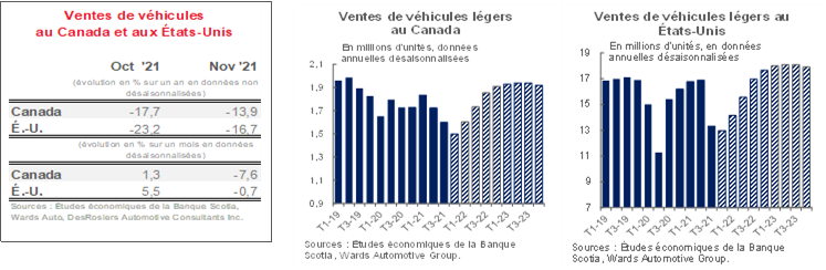 Aux États-Unis, les ventes d’automobiles se sont repliées en novembre : les achats ont perdu -0,7 % sur un mois (en données désaisonnalisées), ce qui nous rappelle que la reprise sera hésitante, puisque les risques guettent toujours. Les ventes annualisées se sont inscrites à 12,9 millions d’exemplaires, ce qui augmente la probabilité que les achats du quatrième trimestre peinent à franchir la barre des 13 millions d’exemplaires en données désaisonnalisées et en rythme annualisé, ce qui s’inscrit dans la foulée du gain de 5,5 % sur un mois (en données désaisonnalisées) en octobre, ce qui a ravivé l’espoir qu’un rebond soit finalement en train de se dessiner. C’est probablement toujours le cas — puisque l’amélioration de la production automobile en Amérique du Nord en novembre est une bonne nouvelle; or, le chemin sera cahoteux. La conjoncture des prix élevés et les stocks limités ont probablement pesé sur la confiance des consommateurs en novembre, tout autant que la multiplication des inquiétudes sanitaires vers la fin du mois. En novembre, les intentions d’acheter des automobiles ont plongé à un creux absolu (et ont dégringolé brusquement de 2,5 points de pourcentage), selon le Conference Board, puisque l’appréciation des prix des véhicules neufs a atteint de nouveaux sommets en octobre (9,8 % sur un an, en données non désaisonnalisées), pour inscrire un gain de 1,4 % sur un mois (en données désaisonnalisées). Par ailleurs, les facteurs porteurs de la demande ont été vigoureux. Les chiffres les plus récents sur les ventes au détail ont inscrit un solide gain de 1,7 % sur un mois, puisque la croissance de l’emploi s’est accélérée en octobre, alors que les demandes d’assurance chômage hebdomadaires plus récentes ont continué de baisser tendanciellement en novembre. Nous avons abaissé les prévisions de cette année à 15,0 millions d’exemplaires en raison de la léthargie du rendement de novembre et du moindre optimisme pour le dernier mois de l’année. La demande est appelée à continuer de dépasser l’offre en 2022. Nous nous attendons à ce que les ventes se hissent à 16,1 millions et à 18,0 millions d’exemplaires, respectivement, en 2022 et 2023. Les nouveaux blocages de la production automobile à cause des facteurs liés à la pandémie dans la chaîne logistique continuent de représenter un risque de baisse important pour ces perspectives.