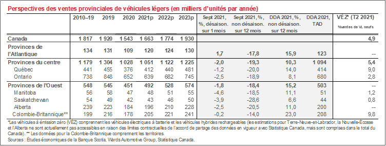 - En septembre, toutes les régions et toutes les provinces, sauf la région de l’Atlantique, ont comptabilisé des baisses des ventes d’automobiles sur un mois. Les pénuries de stocks ont été le facteur essentiel, ce qui n’a pas empêché les provinces canadiennes de l’Atlantique d’inscrire des gains, en raison des replis dans les deux chiffres du mois précédent. Depuis le début de l’année, la région de l’Atlantique, le Québec et la Colombie-Britannique continuent d’inscrire des résultats supérieurs à la moyenne nationale.