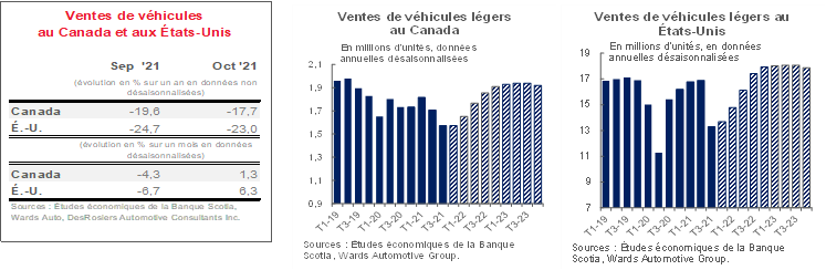 En octobre, les États-Unis ont dégagé une solide hausse de 6,3 % sur un mois (en données désaisonnalisées) dans les ventes de véhicules. Les ventes annualisées se sont quand même maintenues à un chiffre léthargique de 13,0 millions d’exemplaires par rapport à 12,2 millions d’exemplaires en données annualisées et désaisonnalisées en septembre. Les très légères améliorations des stocks accusent, selon les rapports, du retard sur la hausse, menées par le relèvement de la production des usines de Ford et de GM, en particulier, selon Wards Automotive; toutefois, il se peut qu’il y ait aussi des facteurs de rebond plus vigoureux en cause à l’heure où le pays sort de la vague du variant Delta et enregistre un repli des ventes beaucoup plus brusque cet été. Il n’empêche que le ratio des stocks par rapport aux ventes est toujours inférieur à un, de sorte que la remontée des ventes d’automobiles continuera d’être entravée par les stocks limités. Par ailleurs, les facteurs qui portent la demande sont vigoureux grâce à un contexte dans lequel les politiques de l’État sont très conciliantes. Même si la croissance de l’emploi en septembre n’a pas été au rendez-vous des attentes, les demandes d’assurance chômage ont basculé à la baisse en octobre, alors que les grandes intentions d’achats se sont relevées d’un point de pourcentage (également en octobre) selon le Conference Board. Les ventes au détail de septembre ont mis en lumière la résilience des consommateurs, grâce à un gain de 0,7 % sur un mois malgré l’anémie des ventes d’automobiles. Les stocks limités ont continué de faire monter les prix des véhicules neufs en septembre (8,7 % sur un an; 1,3 % sur un mois, en données désaisonnalisées). Nos perspectives pour les ventes d’automobiles en 2021, à 15,2 millions d’exemplaires, risquent probablement toujours de reculer davantage si la production ne se relève pas sensiblement dans les deux derniers mois de l’année, et le manque à gagner des ventes est décalé sur les années à venir en raison des contraintes de la capacité de production dans une conjoncture dans laquelle la demande est forte.