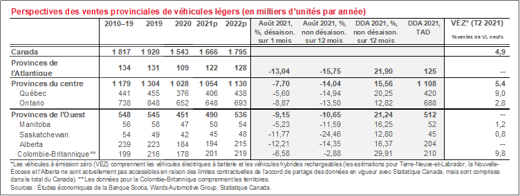 - Dans les provinces de l’Atlantique, les ventes d’automobiles se sont fortement détériorées en août, puisque les quatre provinces ont inscrit des baisses mensuelles dans les deux chiffres. Par ailleurs, l’ensemble de la région comptabilise, depuis le début de l’année, des ventes d’automobiles plus vigoureuses grâce aux incidences plus limitées de la COVID-19. L’Île-du-Prince-Édouard est en fait la seule province dans laquelle les ventes s’inscrivent à des niveaux supérieurs à ce qu’ils étaient avant la pandémie, alors que depuis le début de l’année, les ventes régionales ont perdu -8,5 % par rapport à la même période depuis le début de l’année 2019.
