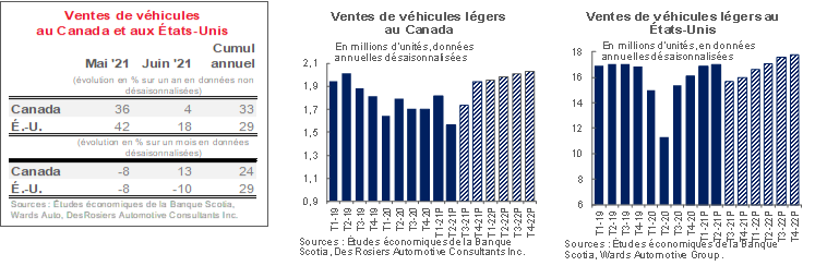 En juin, les ventes de voitures au Canada se sont contentées d’un modeste rebond malgré le déconfinement de l’économie des provinces, à l’heure où la léthargie des stocks a endigué les achats. DesRosiers Automotive Consultants Inc. estime qu’il s’est vendu 163 000 véhicules — soit un gain de 4 % par rapport à l’an dernier, ce qui représente quand même une baisse de 12 % sur juin 2019. En chiffres désaisonnalisés, les ventes ont comptabilisé une amélioration d’environ 13 % sur un mois par rapport à mai alors que la plus grande partie du pays était confinée; toutefois, le rythme des ventes, toujours aussi modeste, s’est chiffré à 1,65 million d’exemplaires en données désaisonnalisées et annualisées. Les ventes du deuxième trimestre ont donc brusquement dégringolé de 14 % sur un trimestre après avoir crû de 5 % en glissement trimestriel au premier trimestre de 2021, pour inscrire une solide progression des ventes de 1,82 million d’exemplaires en données désaisonnalisées et annualisées. En avril et en mai, l’anémie des ventes au Canada peut essentiellement s’expliquer par le confinement, alors que chez nos voisins du Sud, les achats ont été relativement vigoureux au début du printemps, malgré les pénuries chroniques de stocks. Toutefois, sans égard à la vigueur de la demande — comme en témoigne la forte valorisation des prix sur les marchés des véhicules neufs et d’occasion —, les stocks vides des concessionnaires ont probablement empêché un rebond substantiel en juin. Les niveaux de stocks se maintiennent à des creux statistiques en raison de la pénurie mondiale de semi-conducteurs, qui a lourdement pénalisé la production de véhicules en Amérique du Nord. Si la production de véhicules s’est stabilisée en juin, elle ne devrait commencer à s’accélérer qu’en août, selon Wards Automotive Group. Or, ce pronostic est sans doute déjà désactualisé, puisque Ford vient d’annoncer d’autres contingents de production en juillet, dans une conjoncture qui évolue à vive allure. Par ailleurs, les consommateurs se portent toujours aussi bien : le plongeon temporaire des emplois dans le cadre du confinement s’est probablement infléchi en juin; l’épargne des ménages, déjà élevée, a remonté modestement d’un cran au premier trimestre (à 13 %); enfin, les principales intentions d’achat se sont essentiellement stabilisées, hormis les légères détériorations constatées pendant chaque confinement. La progression rapide dans le déploiement des vaccins devrait accélérer la confiance et la consommation à terme… à la condition qu’il y ait des produits à acheter. Dans nos prévisions de base, nous nous attendons à ce que la production automobile s’accélère au troisième et au quatrième trimestres. La demande refoulée de véhicules neufs devrait se dénouer progressivement pour finir l’année à 1,75 million d’exemplaires. Ces prévisions accusent un risque de baisse substantielle compte tenu de l’incertitude qui plane sur les contraintes de l’approvisionnement et de la concurrence qui s’exerce pour le nombre limité de véhicules par rapport à la forte demande américaine.
