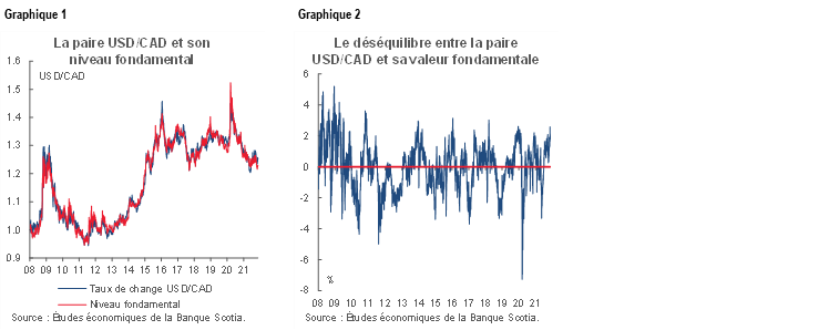 - Nos estimations les plus récentes laissent entendre que le taux de change USD/CAD est actuellement survalorisé d’environ 2 % : les facteurs fondamentaux laissent entendre que la « juste valeur » s’établit à 1,22 $ US par $ CA.