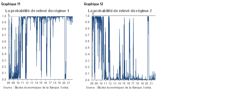 - Nous estimons aussi un modèle journalier de basculement du régime qui indique les moments où le taux de change du dollar CA exprime une plus grande sensibilité aux grandes forces des marchés (volatilité et indice du dollar US) par opposition aux fondamentaux économiques traditionnels (cours du pétrole et différentiels des taux d’intérêt). Notre modèle est un outil utile pour expliquer la performance du dollar CA pendant les périodes de stress avivé des marchés, lorsque les facteurs fondamentaux essentiels jouent un rôle auxiliaire dans les mouvements motivés par les risques ou par la sécurité dans les marchés des changes étrangers.