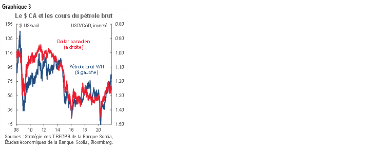 a) Le pétrole brut WTI (graphique 3). Nous tenons compte des cours du pétrole pour comptabiliser l’importance du commerce de l’énergie entre le Canada et les États-Unis. Le Canada accuse constamment un excédent commercial dans le commerce des produits pétroliers avec les États-Unis, de sorte que la hausse des cours du pétrole donne lieu à une augmentation relative de la demande de dollars canadiens, en données constantes. L’évolution des cours du pétrole se répercute aussi sur l’attrait des actifs dans le secteur canadien de l’énergie (qu’il s’agisse des investissements directs ou indirects) et, par le fait même, sur le dollar CA.